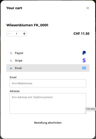 Bitte füllen Sie, wenn Sie ihre Auswahl abgeschlossen haben, Ihre Mailadresse ins Feld "EMail" und schreiben Ihre Adresse inklusive Telefonnummer ins grosse Textfeld "Adresse".